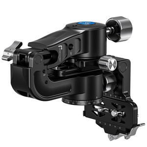 Der seitliche Schwenkarm verfügt über integrierte Gewindebohrungen, an denen sich Zubehör wie Monitore, Mikrofone oder GPS-Empfänger anbringen lässt. Eine Panoramaskala und eine Dosenlibelle erleichtern das präzise Ausrichten für ein- und mehrzeilige Panoramen.