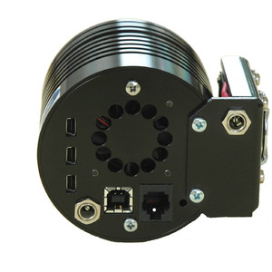 - Der in die Kamera integrierte USB-Hub erlaubt es, bis zu drei Peripheriegeräte zu betreiben (5V DC bei maximal 200 mA). Dank dieser Integration verringert sich der Kabelsalat am Teleskop. Über den RJ11-Ausgang kann ein Guider angeschlossen werden.