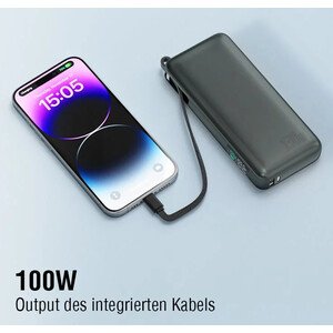 Vergessen Sie das Kabelchaos! Mit unserem eingebauten USB-C-Kabel können Sie nicht nur Ihre Geräte mit bis zu 100W aufladen, sondern auch die Powerbank selbst mit bis zu 60W. Nie wieder ohne Energie, egal wo Sie sind.