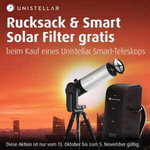 In einer noch bis zum 05. November laufenden Sonderaktion bietet der Hersteller Unistellar seine Smart-Teleskope eQuinox 2 und eVscope 2 nun mit kostenlosem Sonnenfilter und Transport-Rucksack an.