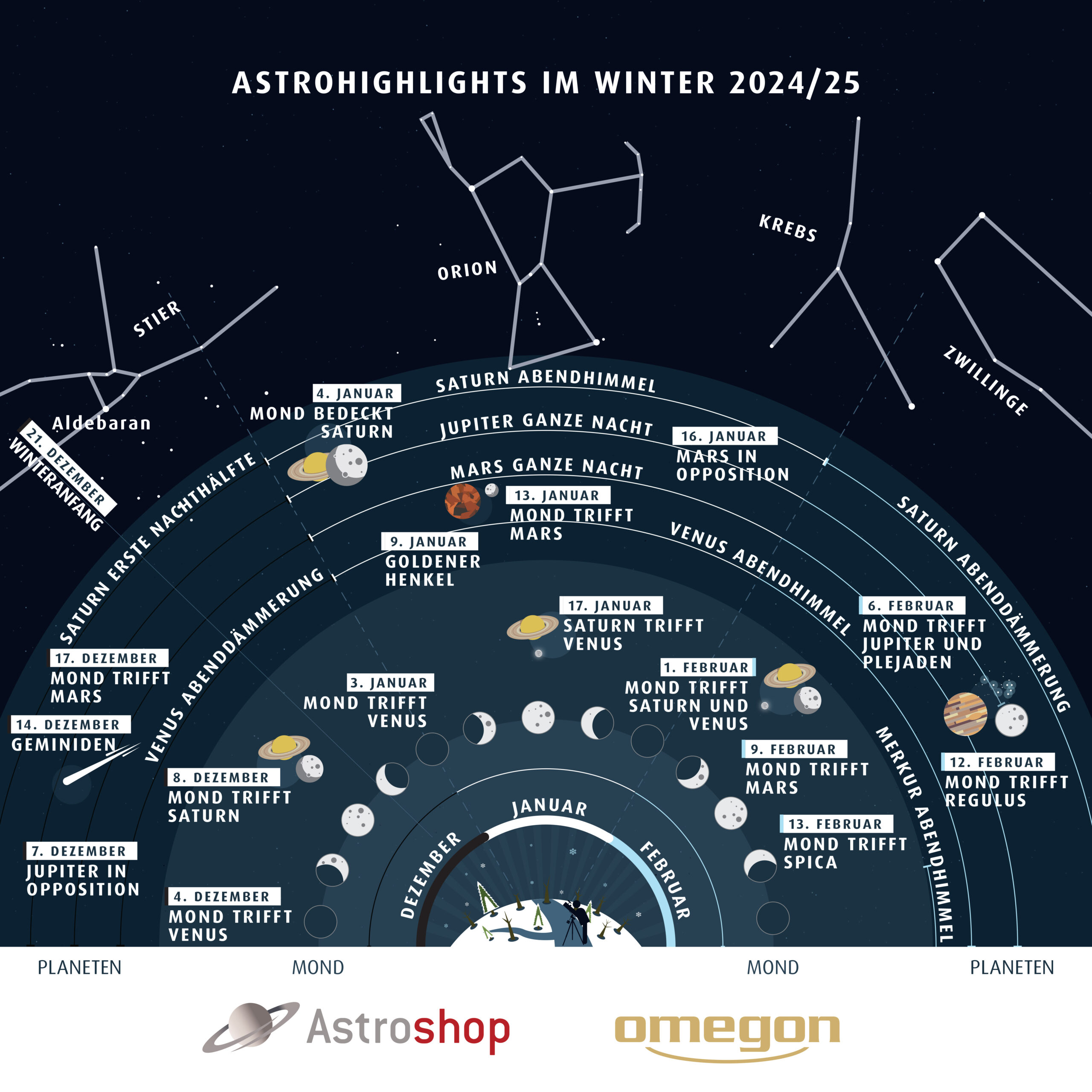 Welche Himmelsereignisse dürfen Sie auf keinen Fall verpassen? Das alles und mehr erfahren Sie in unserer neuen Infografik, die Sie über die schönsten Himmelsspektakel im Winter informiert.