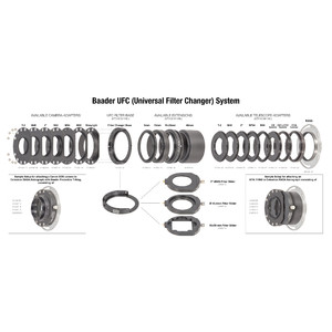 Das UFC-System kann nahezu alles mit allem verbinden, indem man das immer gleiche Filter-Basisgehäuse erwirbt und dann einfach die notwendige Front- und Rückplatte des UFC zusammen mit den Distanzringen so wählt wie es der jeweilige Chipabstand erfordert. Zu diesem Zweck bietet Baader ein Set mit passenden UFC-Verlängerungshülsen, sowie einer von 15mm bis 20mm stufenlos einstellbaren S70 VariLock-Verlängerung an, um den Abstand von Filter und Bildebene so kurz wie möglich zu halten. Alle Bauteile sind optimiert um vor der eigentlichen Filterschublade den größtmöglichem Durchlass zu erhalten und dennoch den passenden Abstand zwischen Teleskop und Chip präzise einstellen zu können. Die Filterschublade selbst sitzt dadurch jeweils so dicht wie möglich vor der Kamera, Abschattung durch die Filter wird minimiert.