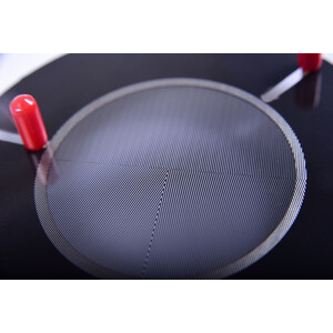 Diese Bahtinov-Maske ist besonders hochwertig: Sie ist aus Aluminium gefertigt, mit lediglich 0,3 Millimeter dicken Streifen. Über die Stifte kann sie um etwa 0,5 Zentimeter angepasst werden.