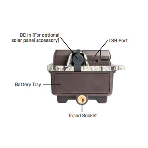 Zur Stromversorgung können Sie entweder sechs AA-Batterien verwenden, oder die Kamera über den DC-Anschluss mit einem Solarpanel verbinden.