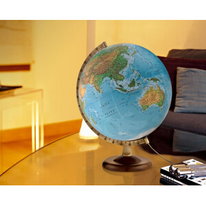 Dieser klassische Globus überzeugt durch einen Holzfuß aus klar lackierter Buche mit lackiertem Metallmeridian. Durch die Doppelbild-Kartografie ist sowohl eine physische als auch eine politische Ansicht möglich. Dabei ist bei ausgeschaltetem Licht die physische Kartografie und bei eingeschaltetem Licht das politisches Kartenbild zu sehen. Die Beschriftung ist auf Deutsch.