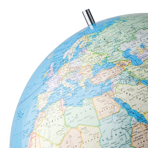 Die klassisch elegante Fußausführung, bei diesem Modell als Gabelfuß, erhalten ihren matt schimmernden Glanz durch ein ganz spezielles Edelstahlfinish. Die Globuskugel ist in einem Winkel von 23° in einem kreisförmigen Vollmeridian aufgehängt.