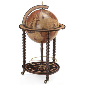 Der elegante Barglobus bietet im Inneren ein Getränkefach für 9 Gläser und 2 bis 3 Flaschen. Auf der unteren Ablagefläche, die mit Naturfarben auf Wasserbasis verziert ist, können weitere Flaschen gelagert werden. Das Kartenbild stellt eine originalgetreue Wiedergabe aus dem 16. Jahrhundert dar.
