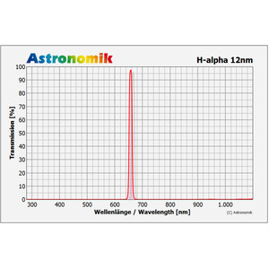 H-Alpha-Filter: Dieser Schmalband-Nebelfilter lässt rotes Licht mit einer Wellenlänge von 656 Nanometer passieren. Das ist die Linie, in der HII-Gebiete (Wasserstoffnebel) leuchten.