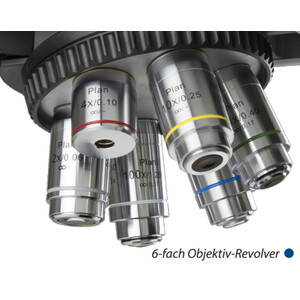 Plan semi-apochromatische PLi-Apo EIS Objektive (4x/0.13; 10x/0.30; 20x/0.50; S40x/0.75; S100x/1.30 Öl). Alle Objektive sind parafokal 60 mm, haben ein Besfestigungsgewinde von M25 mm, sind Anti-Pilz behandelt und AR (Anti-Reflection) beschichtet. Zusätzlich verfügen die Objektive 40x und 100x über eine Federung (S).