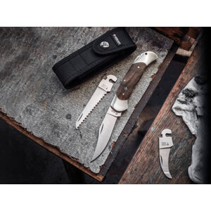 Das Böker Optima ist ein Taschenmesser zum Zupacken und Strapazieren. Die außergewöhnlich starke Klinge aus 4034 ist rostfrei, hohlgeschliffen und durch den Backlock sicher feststellbar. Die Klingen der Optima-Serie sind grundsätzlich austauschbar, sodass das Messer schnell den jeweiligen Anforderungen angepasst werden kann. Das Wechselsystem verwandelt das einteilige Messer in ein praktisches Multifunktionswerkzeug. Der Griffkörper wird aus einem Stück Neusilber gesintert und ist mit Schalen aus edlem Walnussholz versehen. Dieses Set mit Säge und Aufbruchklinge wird mit einem Etui ausgeliefert, das nicht nur einen zusätzlichen Aufbewahrungsplatz für die kurze Aufbruchklinge bietet, sondern auch Stauraum für die Hauptklinge während des Aufbrechens bietet.