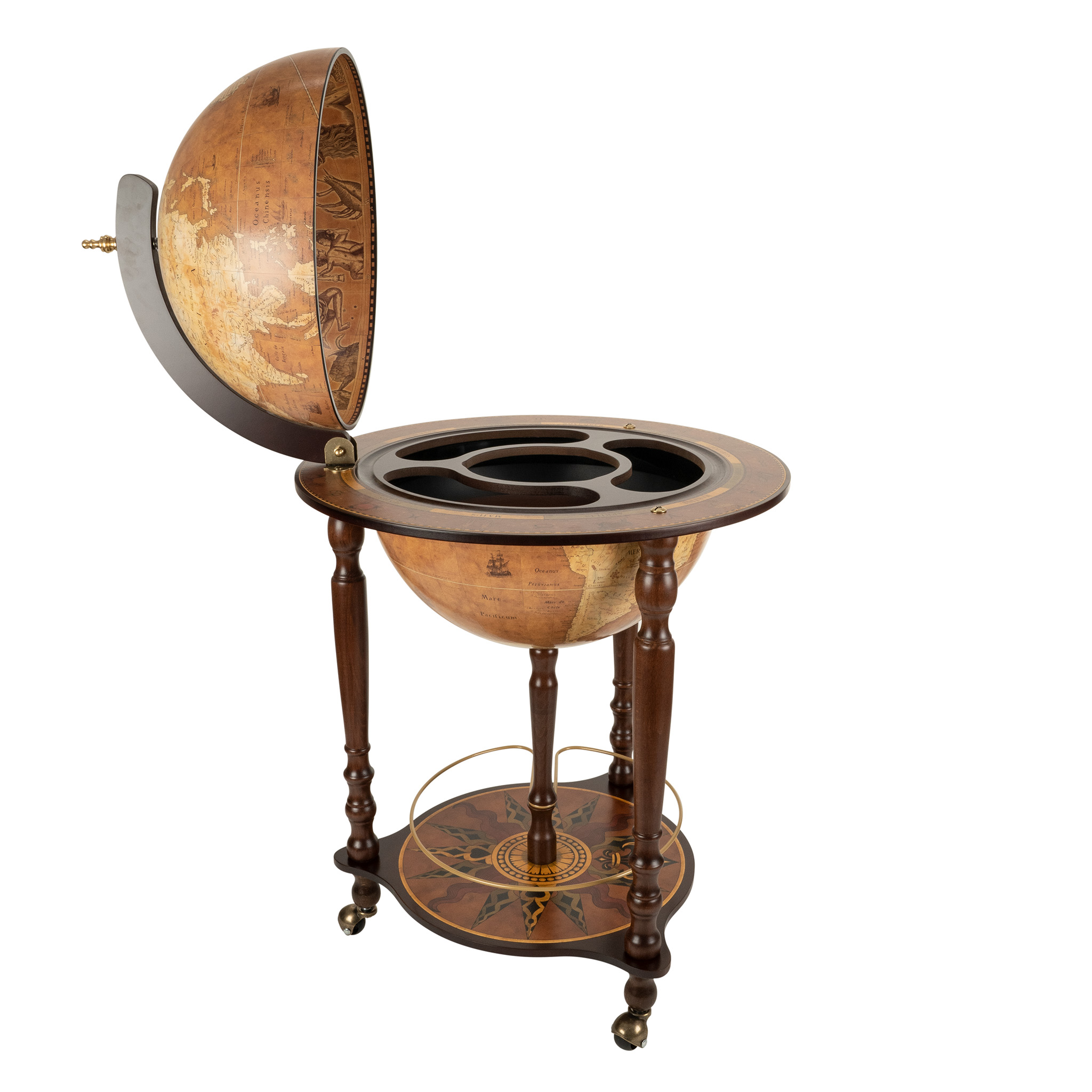 Diese Globusbar bietet im oberen Fach Platz für zwei bis drei Flaschen und neun Gläser. Unterhalb können auf der Ablagefläche noch zusätzliche Spirituosen abgestellt werden. Durch die Lenkrollen ist die Globusbar leichtgängig zu verschieben, ohne dass etwas umgestoßen wird.