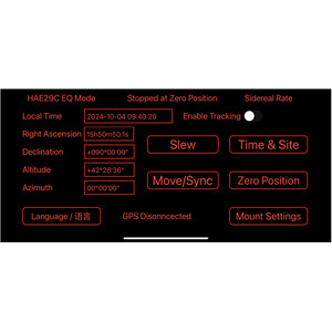 - Die „C“-Modelle (Versionen mit internem Mainboard) mit integriertem WLAN ermöglichen eine externe Steuerung über ein Smartphone/Tablet mittels der App iOptron Commander Lite oder eine App wie Sky Safari; oder über einen Raspberry Pi über einen INDI-Treiber.