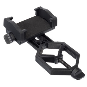 Der Smartphone-Adapter kann mit jedem Smartphone mit 52 bis 100 mm Breite benutzt werden. Die Klemmung hält an Okularen von 25 bis 48 Millimeter Durchmesser.