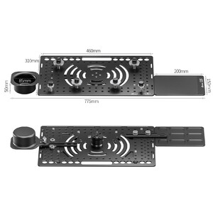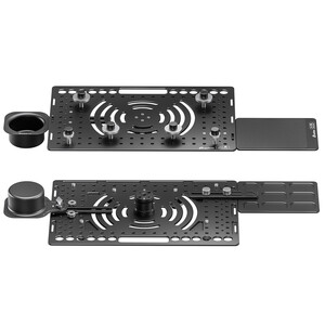 Die eigentliche Laptophalterung hat die Abmessungen 460mm x 310mm und bietet auch Laptops mit einer großen Bildschirmdiagonale ausreichend Fläche. Die 5mm starke Aluminiumplatte liefert eine hervorragende Stabilität mit geringem Gewicht. Die 4 Klemmschrauben sind frei positionierbar und die Klemmflächen sind mit weichem Silikonmaterial belegt, um ihr wertvolles Equipment vor Beschädigungen zu bewahren und sicher an Ort und Stelle zu halten. Zahlreiche Bohrungen und der Durchgriff ermöglichen eine optimale Kabelführung und erleichtert den Transport.