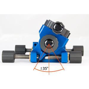 Verstellt wird mittels vier außenliegender Stellschrauben durch Herausdrehen der einen Stellschraube und Nachstellen der gegenüberliegenden Stellschraube. Dadurch kann der Himmelsausschnitt im jeweils montierten Zusatzgerät (z.B. BAADER Vario Finder, Objektiv, Kamera, Spektiv, Guiding-Teleskop o.ä.) sehr genau eingestellt bzw. dem Teleskop angepasst werden. Nachdem die Einstellung erfolgt ist, wird mit beiden Stellschrauben gekontert, sodass der Tangentialneiger festgestellt ist. Im Lieferumgang des Stronghold Tangentialneigers befindet sich ein Edelstahl-Spannstift, der im Lieferzustand in einer Steckhalterung an den Azimutblöcken befestigt ist. Mit Hilfe dieses Spannstiftes können Sie die Elevations-Achse nach erfolgter Einstellung der gewünschten Neigung zusätzlich zu den beiden Verstellschrauben nachziehen, indem Sie den Stift in die seitliche Spannschraube einstecken und im Uhrzeigersinn ein paar Grad festziehen. So erhalten Sie die maximale Steifigkeit des Systems. Zum Verstellen der Achse sollten Sie diese Schraube wieder um den gleichen Betrag lösen.