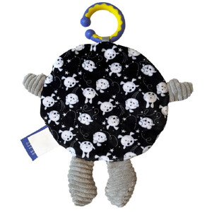 Es enthält eine knisternde Füllung, deren Klang und Haptik die Kleinen begeistert. Die Cordfüße enthalten einen Quietscher und eine Rassel. Der Beißring kann auch als Haken verwendet werden, um das Spielzeug über einem Kinderbett oder Kinderwagen aufzuhängen.