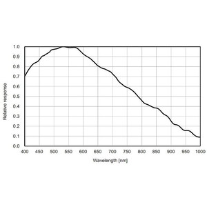 Für den 183 Mono-Sensor liegt der Maximalwert bei ca. 84% (~bei 525nm-575 Monochrom/Grün). Betrachtet man bei der 183-Mono z.B. die H-alpha-Linie bei 656nm, dann sagt die relative Kurve ~0.75 Relativ zu 1.0 (84% QE). Somit ist der wahre Wert von QE bei 656nm ~63%. Ein guter Wert!