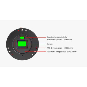 Anforderung an das Teleskop: ZWO Air-Kameras sind mit Teleskopen kompatibel, die APS-C oder größere Bildformate unterstützen. Bei der Verwendung eines Teleskops mit APS-C-Bildkreis kann es zu leichten Verzerrungen am Leitstern kommen. Für eine präzisere und stabilere Nachführung (Autoguiding) empfehlen wir die Verwendung eines Teleskops mit Vollformat oder größerem Bildkreis.