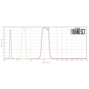 Die spezielle Triband-ERF Schmidtplatte des Triband-SCT weist folgende Transmissionsbereiche auf: 380 bis 400 nm, 480 bis 515nm sowie 630 bis 680 nm. Zusätzlich ist sie im UV-Bereich (unter 380nm) und im IR-Bereich (über 680nm) geblockt, um sowohl kurzwellige Strahlung als auch Hitzeentwicklung zu vermeiden.