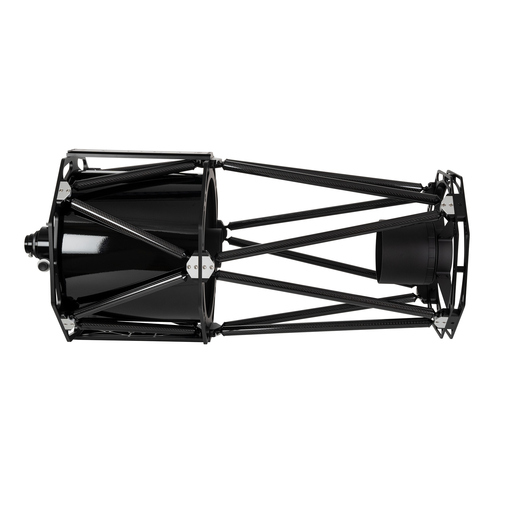 Die meisten Profiteleskope besitzen ein Gitterrohr-Design. Die damit verbundenen Vorteile nutzt auch dieses Instrument. Die Carbonrohre sind versteift, leicht und besonders temperaturstabil. Ein weiterer Grund, warum der Fokus stabil bleibt. Der Luftaustausch gelingt im offenen Gitterdesign besser und verhindert entstehendes Mikroklima im System.