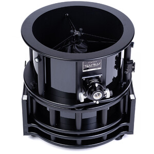• Hauptspiegelzelle: Ein perfekter Spiegel kann nur dann seine Leistung ausspielen, wenn er richtig unterstützt wird. Die Taurus Dobsons verwenden je nach Spiegelgröße 9, 18 oder sogar 27 (beim 20-Zöller) Nylon-Auflagepunkte, um das Gewicht des Spiegels optimal zu verteilen. In horizontaler Position ruht der Spiegel auf einem speziellen Band, der das Gewicht gleichmäßig verteilt. Die seitliche Unterstüzung erfolgt über drei stabile Halterungen. Die ganze Mechanik der Spiegelzelle besteht aus einer pulverbeschichteten Aluminiumlegierung. Bei der Kollimation (Justage) des Spiegels wird die gesamte Fassung bewegt. Der Spiegel selbst bleibt stehts in seiner Position. Der Hauptspiegel kann zur Reinigung aber einfach entnommen werden, denn er ist nicht geklebt. Die offene Konstruktion sorgt für eine schnelle Anpassung der Spiegeltemperatur an die Umgebung.