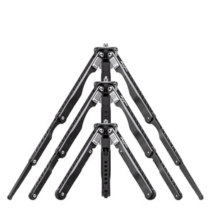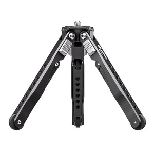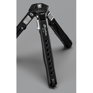 Die Beine lassen sich zusätzlich noch in drei verschiedenen Winkeleinstellungen abspreizen. Dies macht es ideal für ein leichtes Makro-Stativ oder auch für die Tabletop-Fotografie. Durch die Flexibilität der Beine kann man es an Ästen oder Stangen befestigen. In den oberen beiden Stativbeinsegmenten sind zahlreiche 1/4"-Gewindebohrungen für die Befestigung von weiteren Zubehörteilen, z. B. Leuchten, Smartphonehalterungen usw.