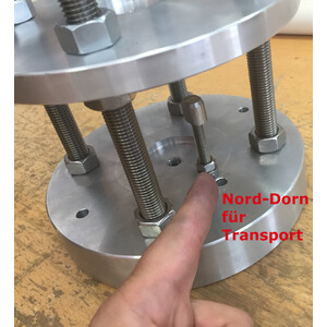 Für diesesn Betonsäulenadapter ist ein passendes Schalungsrohr notwendig (nicht im Lieferumfang enthalten) welches die Form der späteren Säule gibt. Der Norddorn (bei manchen Montierungen Süddorn) wird für den Transport UMGEKEHRT in ein freies Gewinde geschraubt; bitte nicht mit Beton übergiessen sondern rausschrauben und in das vorgesehenen Loch schrauben. Die Höhe des Dornes kann mit den zwei Schraubmuttern eingestellt werden (kontern). Es empfiehlt sich vor dem Betonieren die EQ6 oder EQ8 auf der oberen Platte auszuprobieren (im Klartext draufschrauben und dann wieder entfernen - dann sieht man auch wie viel Platz für die Hand nötig ist die zentrale Befestigungsschraube festzuziehen). Dieser Test kann auch kurz vorm betonieren gemacht werden. Die Plattform sollte aus stabilitätsgründen einen gringen Abstand zum Beton haben (Abstand: Deck-Ebene bis Trage-Ebene). Die mittlere Platte kann durch die 4 Schraubenmuttern auf- und niedriger gestellt werden. Optimal wäre, wenn die mittlere Platte auf dem noch flüssigen Beton "schwimmt", sowie der Abstand zwischen der mittleren und oberer Plattform so groß ist, dass man mit der Hand oder einem Schraubwerkzeug noch Platz hat.