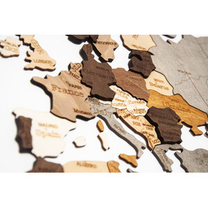 - Die Karte zeigt Ländernamen, Hauptstädte, sowie Grenzen der Länder und Regionen. Die Schrift ist in das Holz eingraviert.