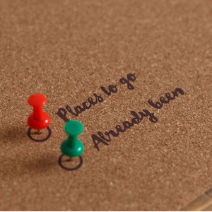 Das politische Kartenbild ist ohne Beschriftung in einer eleganten und klaren Form im Siebdruckverfahren aufgedruckt. Am linken, unteren Rand ist zusätzlich noch eine Legende angebracht mit der Aufschrift "Places to go" und "Already been". So können zum Beispiel mit den zwei farblich unterschiedlichen Pins jene Orte markiert werden, die schon besucht wurden oder noch auf der Agenda stehen! Enthalten sind jeweils 10 rote und 10 grüne Markierungsnadeln.