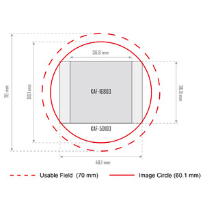 - Einen korrigierten Bildkreis von 60 Millimetern für nadelscharfe Sterne bis in die äußersten Ecken der größten verfügbaren Sensoren. Der nutzbare Bildkreis liegt sogar bei 70 Millimetern.