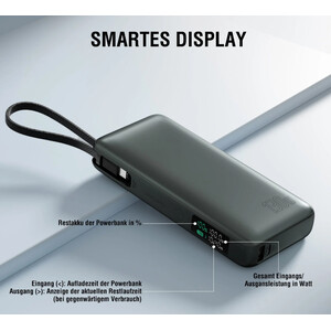 Das integrierte LCD-Display zeigt Ihnen den aktuellen Akkustand der Powerbank, die verbleibende Ladezeit beim Aufladen und die Restlaufzeit, wenn ein Gerät angeschlossen ist. Behalten Sie jederzeit die volle Kontrolle über Ihre Energieversorgung.