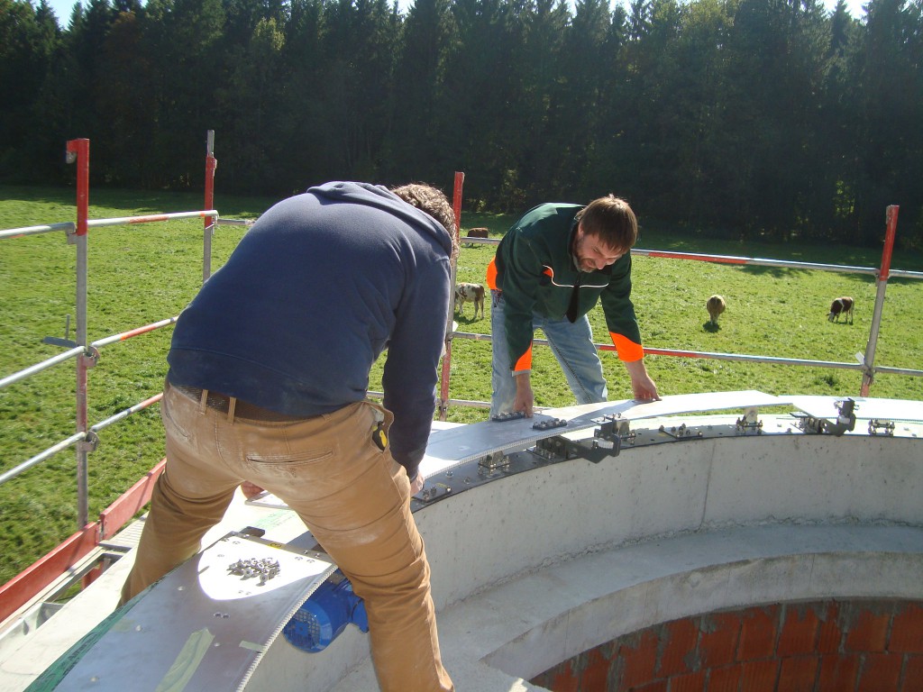 Im Laufe des Tages wurden alle Elemente auf dem Ring platziert und verschraubt. Der aufwendigste Schritt war die Montage des Beobachtungsfensters. Mit einem Gewicht von ca. 200 kg wurde es von vier Personen gesichert aufgesetzt und geschlossen. Die Kuppelstruktur war fertig.