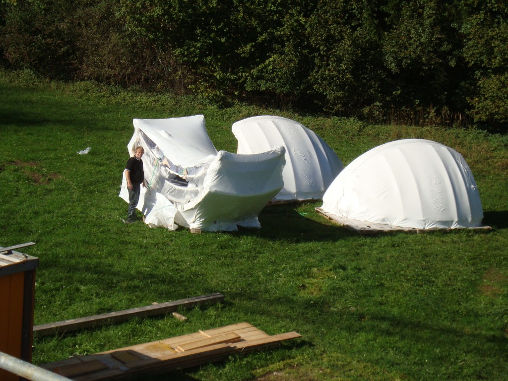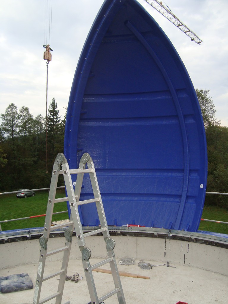 Das Projekt schritt sehr zügig voran. Die Kuppel wurde auf drei großen Paletten geliefert. Die aufwendige Verpackung schützte zuverlässig vor Beschädigungen. Auf der Wiese vor der Sternwarte wartete die Kuppel eine Woche auf den Aufbau. Der Termin wurde den meteorologischen Vorhersagen angepasst. Bei der Größe der einzelnen Elemente wäre Wind ein ernstes Hindernis.