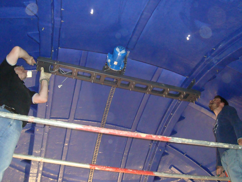 Die Montierung bestückt mit einer 16″ Meade  Optik hat die Raumkapazität der Sternwarte sichtlich erschöpft. Durch den Umstieg von einer azimutalen Gabelmontierung auf eine paralaktische sind die  Maße des Spalts nicht mehr ausreichend.