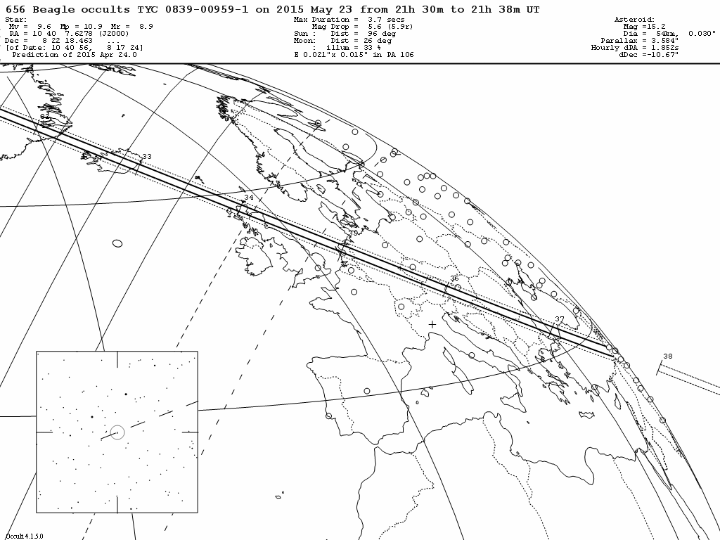 Zuerst bedeckt (58) Concordia um 23:15 Sommerzeit einen Stern mit 10ter Magnitude. Um 23:35 Sommerzeit folgt dann (656) Beagle mit der Bedeckung eines 9,4 mag hellen Sterns.