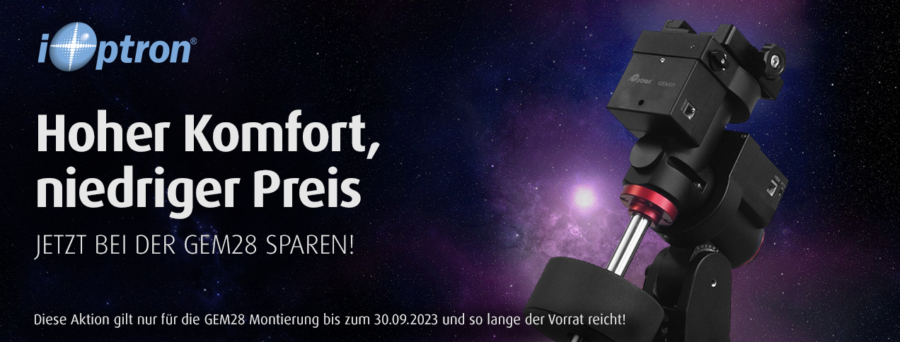 Der Sommer ist vorüber, die Ferienzeit nahezu auch überall…Vorfreude auf den beginnenden Herbst kann aber dennoch aufkommen, da es astronomisch gesehen wieder früher dunkel wird, längere Nächte für das Hobby zur Verfügung stehen und wir Ihnen in unserem September-Angebot die GEM28 Montierungen von iOptron zu günstigen Preisen anbieten – ab Lager und mit vollem Lieferumfang! Die GEM28 ist perfekt für die mobile Astrofotografie, denn sie trägt bis zu 13 kg, kann aber aufgrund ihres kompakten Designs und geringen Eigengewichtes fast überall hin mitgenommen werden. Im Vergleich zu den „center-balanced“ CEM Montierungen von iOptron, handelt es sich bei der GEM-Serie um klassische, parallaktische Montierungen mit neuester Technik und schlankem Design. Die GEM28 ist seit etwa zwei Jahren auf dem Markt und erfreut sich großer Beliebtheit unter Astrofotografen und Beobachtern gleichermaßen, die eine sehr gute Montierung der „EQ5-Klasse“ suchen.