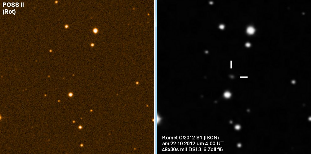 Der Komet ISON (C/1012 S1) ist der Star des Jahres 2013. Ab November können wir ihn mit dem bloßem Auge erkennen. Auf seinem Weg um die Sonne wird er stetig heller. Ende November/Anfrang Dezember erreicht er dann seine größte Helligkeit, so dass er sogar am Taghimmel zu sehen ist. Nach den Vorhersagen kann die Schweiflänge bis auf 60° wachsen.