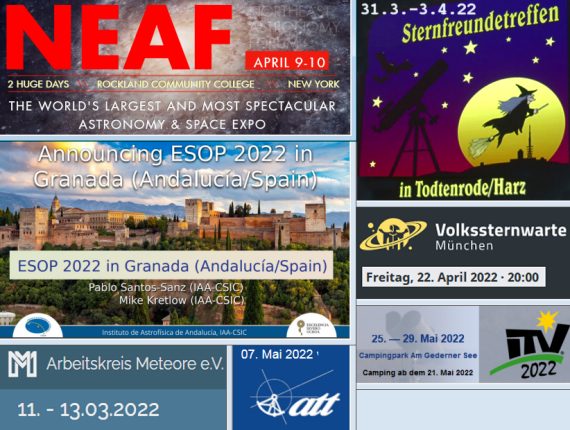 Im März 2023 sind aktuell 3 Termine geplant. Das Treffen des Arbeitskreis Meteore (AKM) soll vom 17. bis 19.3.22 in der Jugendherberge von Bad Kissingen stattfinden. Bernd Gährken wird hier über seinen Texas-Besuch zum Maximum der Tau-Herkuliden berichten. Peter Slansky berichtet über das PERAMIS Projekt in den Schweizer Alpen bei dem unser Astroshop-Mitarbeiter als Co-Beobachter dabei gewesen ist. Aktuelle Infos dazu gibt es unter: https://www.meteoros.de/akm/akm-treffen/2023-bad-kissingen