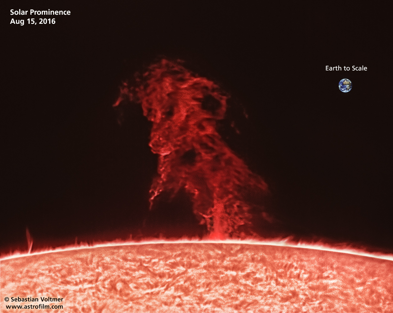 Das Bild vermittelt einen Eindruck, wie riesig eine Sonnen-Protuberanz im Vergleich zur Erde sein kann. In dieser Protuberanz vom 15. August 2016 hätte die Erde aufgereiht mehr als 13-mal Platz gehabt.
