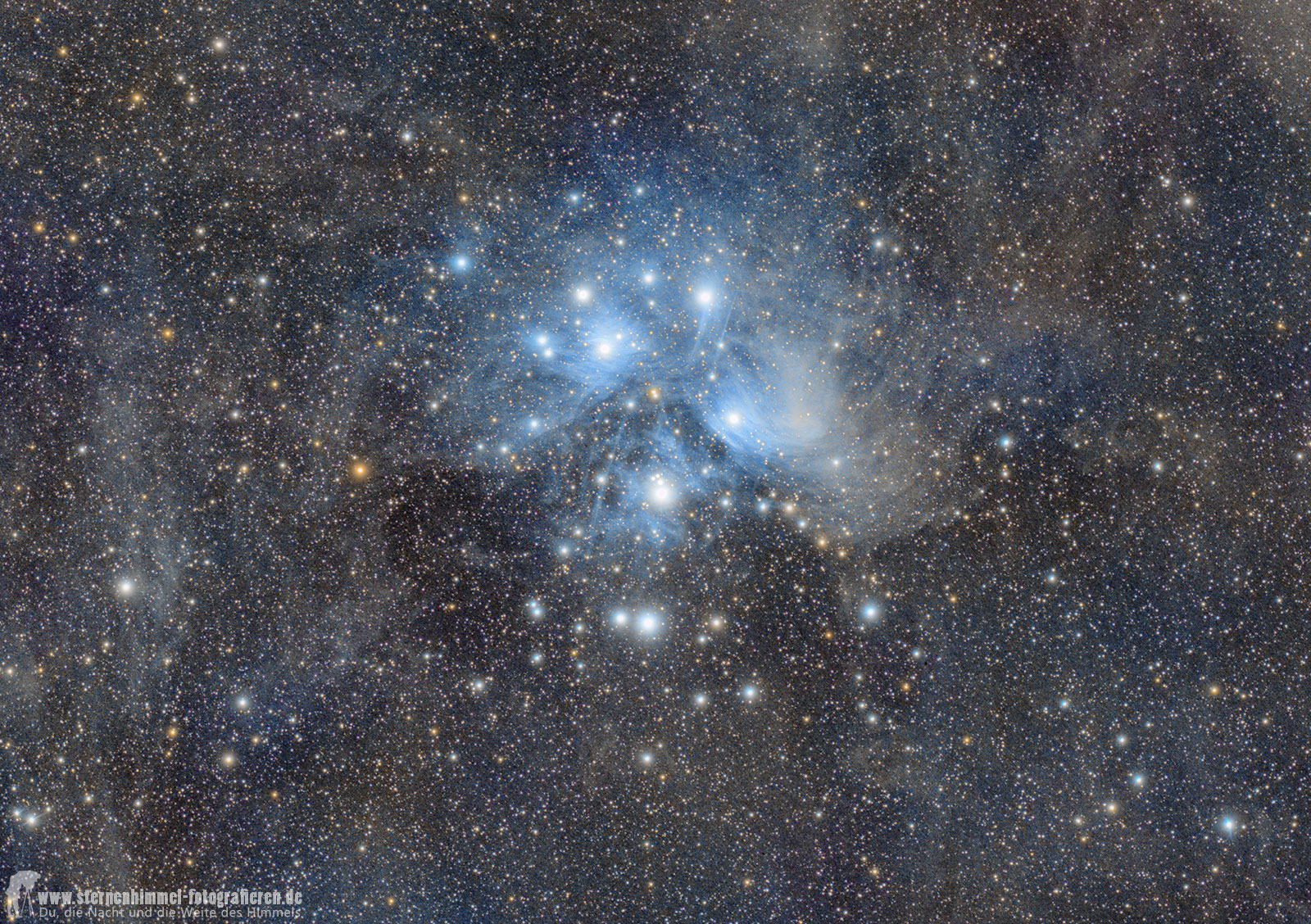 Die Plejaden mit Reflexionsnebel, APO 71/450 Quadruplet, Canon 6Da, 32×180 Sekunden, Aufnahme: Philipp Keltenich