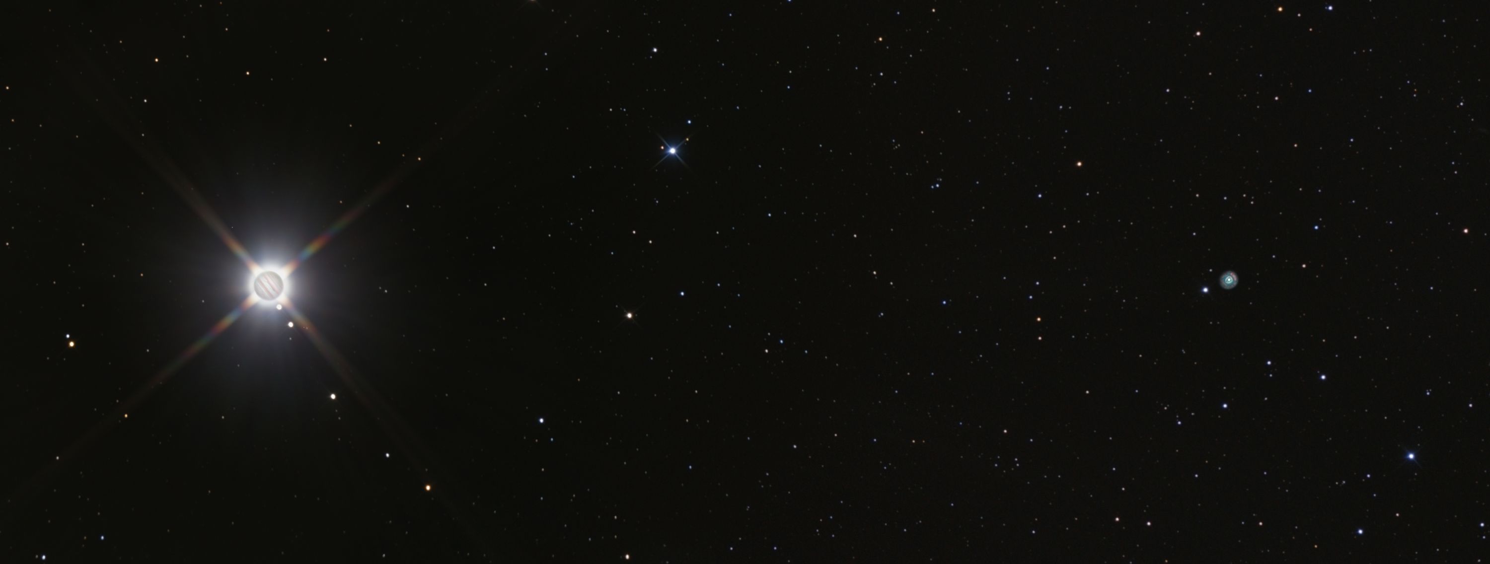 Rund 5000 Lichtjahre trennen die beiden Objekte in diesem Bild. Links der hell strahlende Jupiter, rechts der Eskimonebel (NGC 2392). Bei letztgenannten handelt es sich um einen planetarischen Nebel, das ist die abgestoßene Hülle einer gestorbenen Sonne. Am frühen Morgen des 12. November kamen sich die beiden so verschiedenen Objekte im Sternbild Zwillinge doch recht nahe, zumindest was ihren Winkelabstand am Himmel anbelangt.