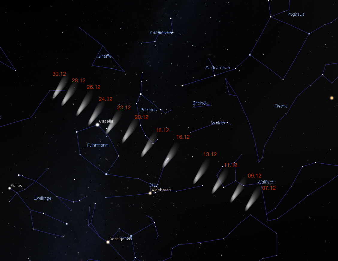 Der Weihnachtskomet erfreut uns auch im neuen Jahr, denn war der Komet nur am Abendhimmel oder am Morgenhimmel zu sehen, ist er nun zirkumpolar geworden und wandert durch das Sternbild des Großen Bären. Beobachten Sie ihn jetzt also die ganze Nacht lang.