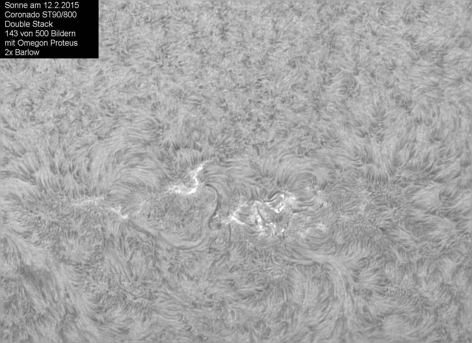 Leider waren an diesem Tag keine Protuberanzen zu sehen, doch ein paar schöne Bilder der Oberfläche waren möglich. Verwendet wurde eine Omegon-Proteus, die als Schwarzweiß-Kamera im roten H-Alpha-Bereich eine optimale Auflösung liefert.