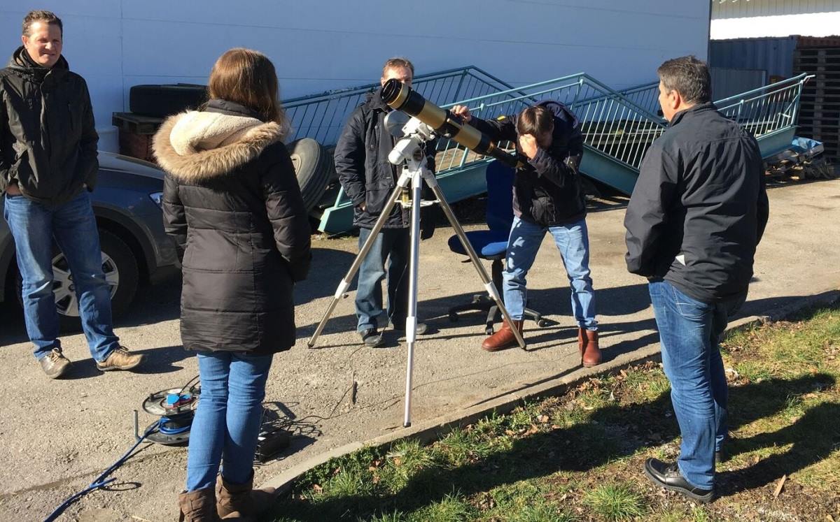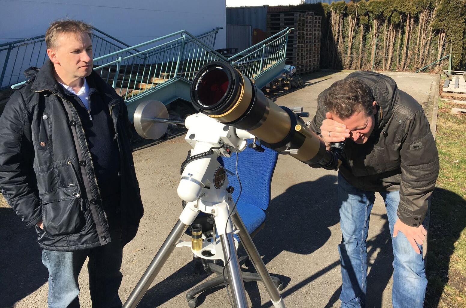 Unsere Berater bei der H-alpha Beobachtung der Sonne durch ein Lunt ST80/560 Ha Teleskop mit Binokular