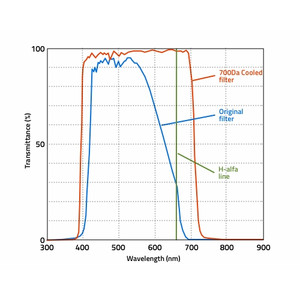 Das kleine A im Produtknamen steht für astromodifiziert. Von Haus aus schneidet der Filter des Sensors den roten Spektralbereich etwas ab. Für die Verwendung in der Astronomie ist das ein Problem, weil in diesem Bereich des optischen Spektrums auch die wichtige H-alpha-Linie liegt, in der viele Gasnebel leuchten. Die Abbildung rechts zeigt, wie durch den Einbau eines speziellen Filters in der astromodifizierten Version die Lichtdurchlässigkeit (Transmission) zu Gunsten der Astrofotografie geändert wurde.