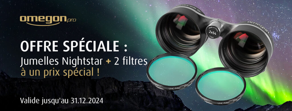 Découvrez la beauté du ciel étoilé avec les jumelles 2×54 à très grand champ proposées ici dans un ensemble avec leur jeu de filtres dédiés.