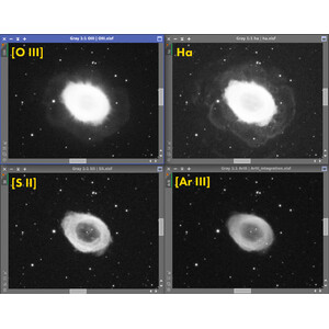 Les exemples d'images de Nico Carver montrent M57, photographié avec la miniCAM8 et les filtres ArIII, SII, Ha, OIII. Les images montrent les clichés pris à travers les différentes lignes, ainsi que l'image combinée.