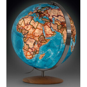 Plus de 2 000 noms géographiques sont répertoriés sur ce globe lumineux contrefait à la main. Le texte est clair et chaque pays est représenté dans une couleur différente, avec une teinte plus foncée aux frontières afin de mieux faire ressortir la carte politique.
