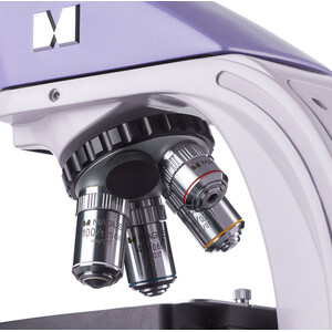 La tourelle porte-objectifs rotative est orientée vers l'intérieur, ce qui laisse libre l'espace au-dessus de la platine. Cinq objectifs peuvent être insérés simultanément dans la tourelle porte-objectifs (4 objectifs sont fournis et le 5e port est prévu pour un objectif supplémentaire). Dans la configuration de base, les objectifs corrigés pour l'infini offrent un grossissement de 40 à 1000 fois. Avec des oculaires en option, la limite supérieure peut être portée à 1500x, 1600x ou 2000x.