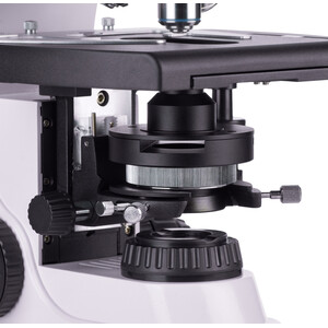 Le condenseur d'Abbe est réglable en hauteur et peut être centré. L'éclairage est contrôlé par le réglage de l'iris et du diaphragme de champ, et il est possible de régler l'éclairage de Köhler pour obtenir une image plus claire. Le condenseur dispose d'une fente pour l'installation d'un déphaseur ou d'un déphaseur à fond noir, ce qui accélère le processus et facilite le passage d'une technique de microscopie à une autre.